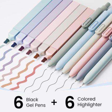 JIMMIDDA- 12 Pack Gel Pens, 0.7mm Black Ink Fine Point Smooth Writing with Aesthetic Highlighters, Quick-dry Long-lasting Pens Set for Journaling School Office Supplies(6 Pens + 6 Highlighters) | ⭐ Art Stationers Best Choice