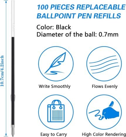 JANYUN 100 Pieces Ink Pen Refills Replaceable, 0.7mm Ballpoint Pen Refills 107 mm in Length Black Ink Refills Smooth Writing Pen Refills for Journal Writing Office School Supplies (Black) | ⭐ Art Stationers Best Choice