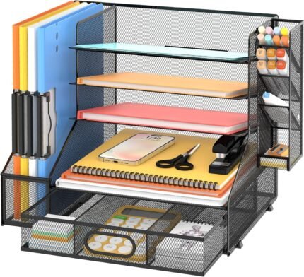 DALTACK Mesh Desk Organizer, 5-Tier Paper Letter Tray with File Holder & Pen Holder & Sliding Drawer, Desktop Organizer and Storage for Desk Accessories Office Supplies, Black | ⭐ Art Stationers Best Choice