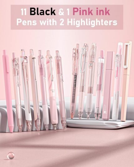 Four Candies 14Pack Pastel Gel Ink Pen Set,Cute Retractable 0.5mm Fine Point Pen,Note Taking Aesthetic Pens,12 Pack Black Ink Pens with 2Pack Highlighter, Smooth Writing Pens for School, Office (Pink) | ⭐ Art Stationers Best Choice
