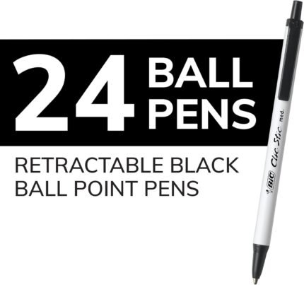 BIC Clic Stic Black Retractable Ballpoint Pens, Medium Point (1.0mm), 24-Count Pack, Round Barrel Design for Comfortable Writing | ⭐ Art Stationers Best Choice