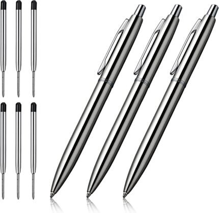 ChaoQ 3 Pcs Retractable Metal Ballpoint Pens, for Gift, Business, Office, 1.0mm Medium Point Black Ink, 6 Extras Replaceable Metal Refills – Stainess Steel | ⭐ Art Stationers Best Choice
