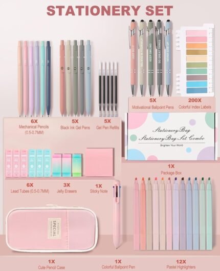 56 PCS Aesthetic School Supplies with Large Pencil Case, 5 Inspirational Ballpoint Pens, 12 Pastel Highlighters, 5 Black Ink Gel Pens, 6 Mechanical Pencils 0.5-0.7mm Student Essentials (Pink) | ⭐ Art Stationers Best Choice