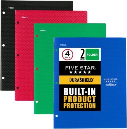 Five Star 2-Pocket Folder, 4 Pack, Plastic Folder with Stay-Put Tabs and Prong Fasteners, Fits 3-Ring Binder, Holds 8-1/2″ x 11ā Paper, Black, Fire Red, Forest Green, Pacific Blue (38049) | ā Art Stationers Best Choice