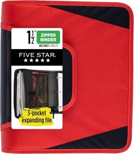 Five Star Zipper Binder, 1-1/2 Inch 3-Ring Binder with Round Rings, 3-Pocket Expanding File, 500 Sheet Capacity, Fire Red (72206) | ā Art Stationers Best Choice