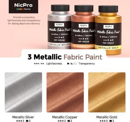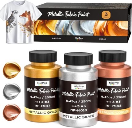 Nicpro Metallic Fabric Paint 3 Colors Gold, Silver, Copper, 25.35oz/750ml Permanent Soft Fabric Paint for Clothes, Non-Toxic Gold Leaf Textile Paint for Fabric Furniture Leather Crafts T-shirts Shoes | ā Art Stationers Best Choice
