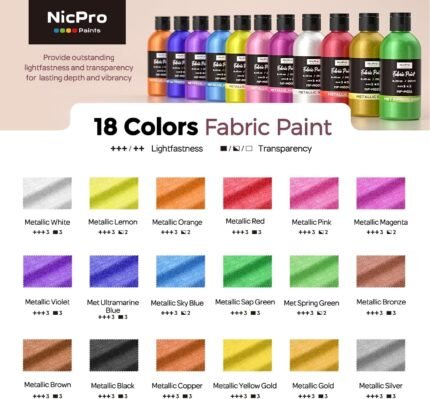 Nicpro 18 Colors Metallic Fabric Paint (8.45oz, 250ml) Permanent Soft Fabric Paint for Clothes, Non-Toxic Textile Paint for Fabric DIY Crafts, T-shirts, Shoes Jeans Bags for Kid Adult with Color Wheel | ā Art Stationers Best Choice