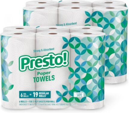 Amazon Brand – Presto! Flex-a-Size Paper Towels, 158 Sheet Huge Roll, 12 Rolls (2 Packs of 6), Equivalent to 38 Regular Rolls, White | ā Art Stationers Best Choice