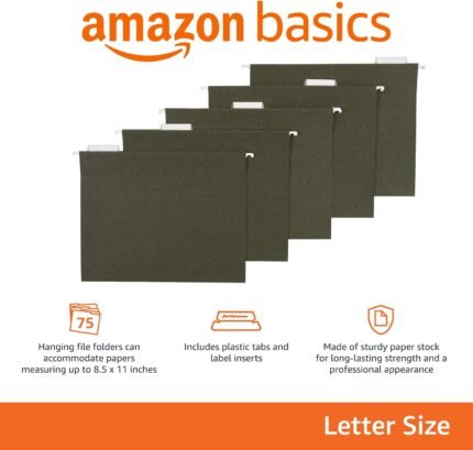 Amazon Basics Hanging File Folders, Letter Size, 1/5-Cut Tabs, 75 Count per Box, Standard Green | ā Art Stationers Best Choice