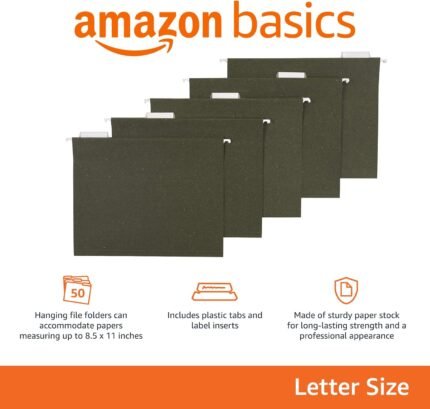 Amazon Basics Hanging File Folders, 1/5-Cut Tabs, Letter Size, Standard Green, 50 Count per Box | ā Art Stationers Best Choice