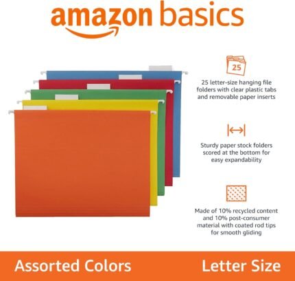 Amazon Basics Hanging Organizer File Folders for Efficient Filing, Assorted Colors, Letter Size (Pack of 25) | ā Art Stationers Best Choice