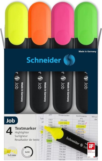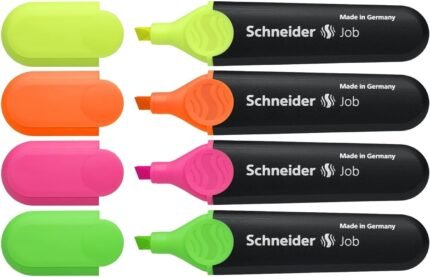 Schneider Job Highlighters, Chisel Tip, 1 + 5 mm, Black Barrel, Assorted Ink Colors, Pack of 4 Highlighters: Orange, Green, Pink, Yellow (1500) | ā Art Stationers Best Choice