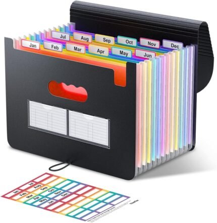 ThinkTex Accordion File Organizer, 12 – Pocket Expanding File Folders for Paper Receipts, Bills&Taxes Organizer, Letter/A4 Size Document Holder for School, Office, Home with Colorful tabs- Black | ā Art Stationers Best Choice