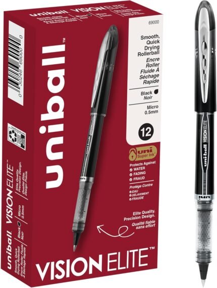 uni-ball Vision Elite Rollerball Pens Fine Point Micro Tip, 0.5mm, Black, 12 Pack | ā Art Stationers Best Choice