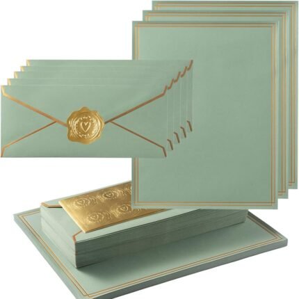 50 Pack Stationery Set with Gold Border, #10 Business Envelopes and 8.5×11 Paper Sheets and Stickers for Writing Letters (Sage-Green, 8.5×11 Inches) | ā Art Stationers Best Choice