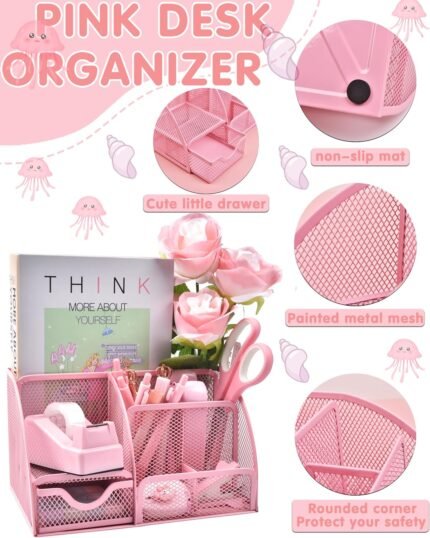 Pink Desk Accessories, 24Pcs Pink Office Supplies and Desk Organizers, with Tape Dispenser, Stapler, Staple Remover, Ect, Fill Your Desktop with Lovely Pastel Colors, Back to School | ā Art Stationers Best Choice