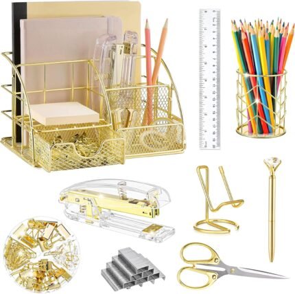 Gold Desk Organizers and Accessories Office Supplies Set Stapler, Pen Holder, Phone Holder, Scissors, Pen, Ruler, 30 Paper Clips, 22 Binder Clip, 20 Tacks and 1000pcs Staples (Gold) | ā Art Stationers Best Choice