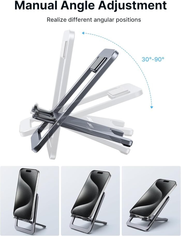 Angle Adjustable: The office desktop cellphone holder stand supports angle adjustment from 0° to 90°, you can flexibly customize the angle of your device to find the most comfortable viewing angle