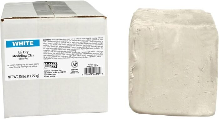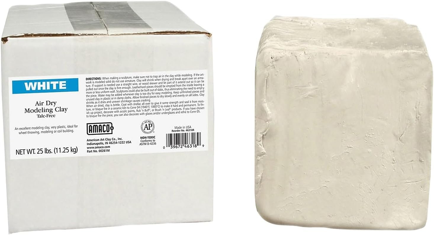 Our inexpensive all-purpose air dry clay is perfect to sculpt, hand model, or throw on a potter’s wheel. Air dry Your finished pieces slowly and evenly on all sides. Decorate with paint. Seal with shellac for strength and to waterproof. This clay can also be fired to cone 04 for hardness/permanence and to glaze. Includes 25 lbs. Of white air dry clay.