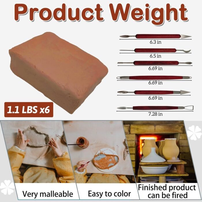 6.6 lbs brownish red pottery clay (1.1lbs x 6 packs)6 Pcs Clay Tools