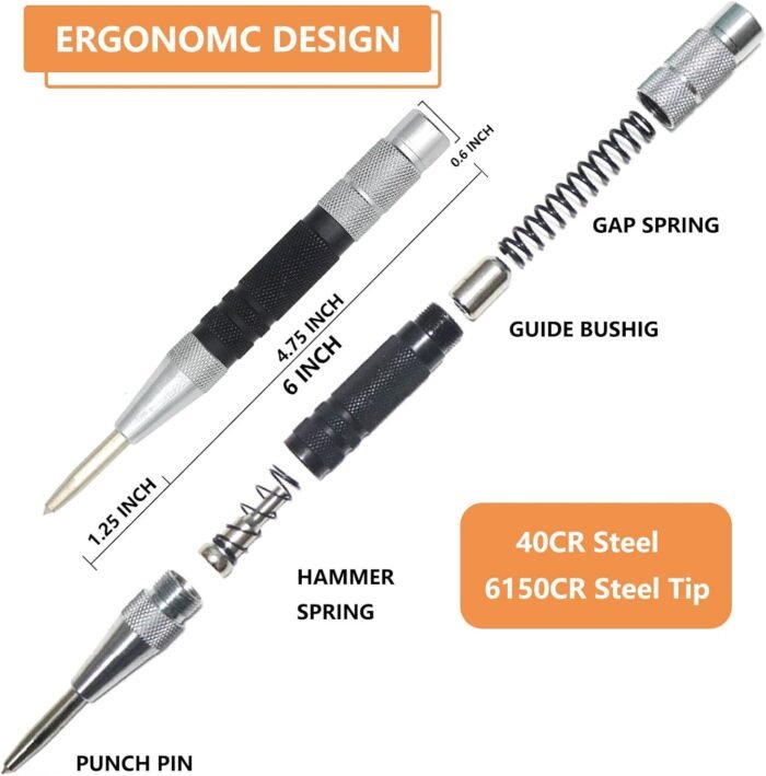 āž¤Wide Application: The Automatic Center Punch can punch, mark, scribe and start drill, nail or screw holes. Used for centering projects for wood, steel, glass, plastics etc. It also may be used as an emergency window-breaking tool