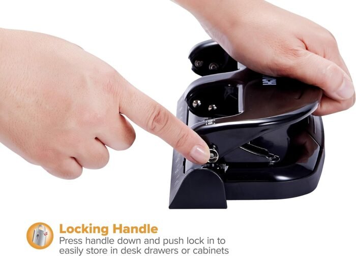 Very easy to use, it’s lightweight, very good material, I like the small compact size. It’s also has a locking handle, it’s all metal and it punches up to 20 sheets at a time. I highly recommend purchasing one. Arrived very well packaged!