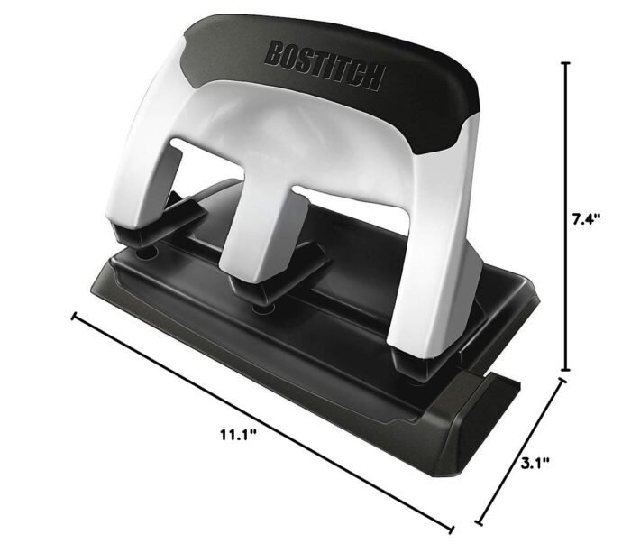 Comfortably and easily slice through stacks of paper with 50% less effort using EZ Squeeze technology. With an all-metal design and a wide handle for maximized comfort, confidently three-hole punch up to 40 sheets of paper with 50% less force than comparable punches. Ensure professional, consistent 3-hole placement using the built-in paper guide. The easy-to-clean chip tray maintains a tidy environment while the rubber base of the paper punch provides extra stability and protects your desktop during heavy use. With a versatile range of 1 sheet to 40 sheets, this punch works for light duty to heavy duty use. Great for work, school, or the home office. Standard three hole configuration with 9/32ā diameter holes.