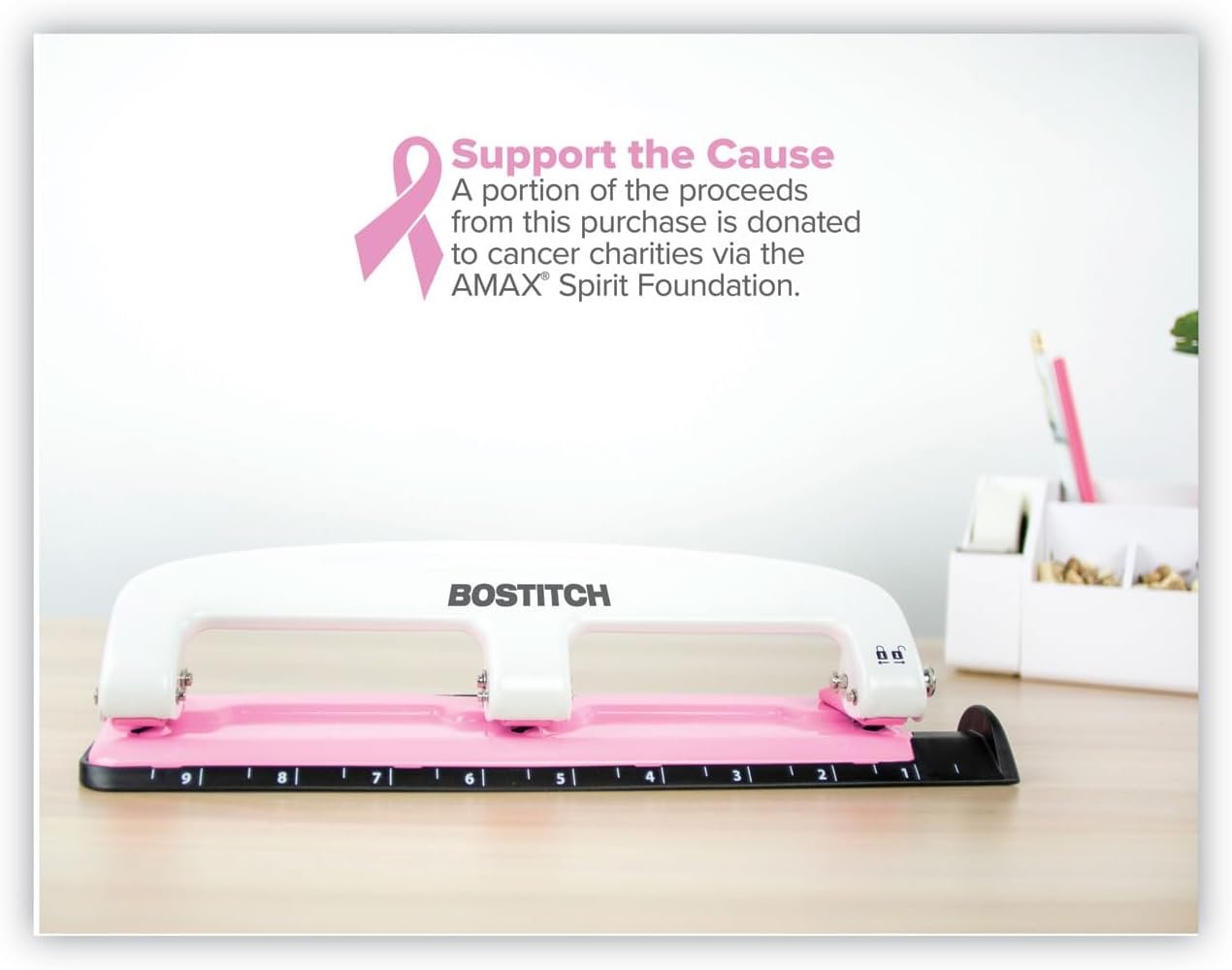 Paperwork can be a hassle, but hole punching it shouldn’t be. With this Bostitch three-hole punch with PaperPro technology, experience 50% easier, jam-free punching when you need it most. For demanding environments, the sleek all metal construction delivers impressive performance while the base’s non-slip grip protects your desktop and provides stability during use. The integrated ruler and paper guide provide consistency during punching, and the handle locks down for compact storage. Built-in waste chamber collects unwanted chips and easily empties through a door. With a smooth, curved ergonomic handle shape, conquer paper stacks with unprecedented ease. A portion of the proceeds from this sale is donated to cancer charities via the AMAX Spirit Foundation. Three-Year Limited Warranty.