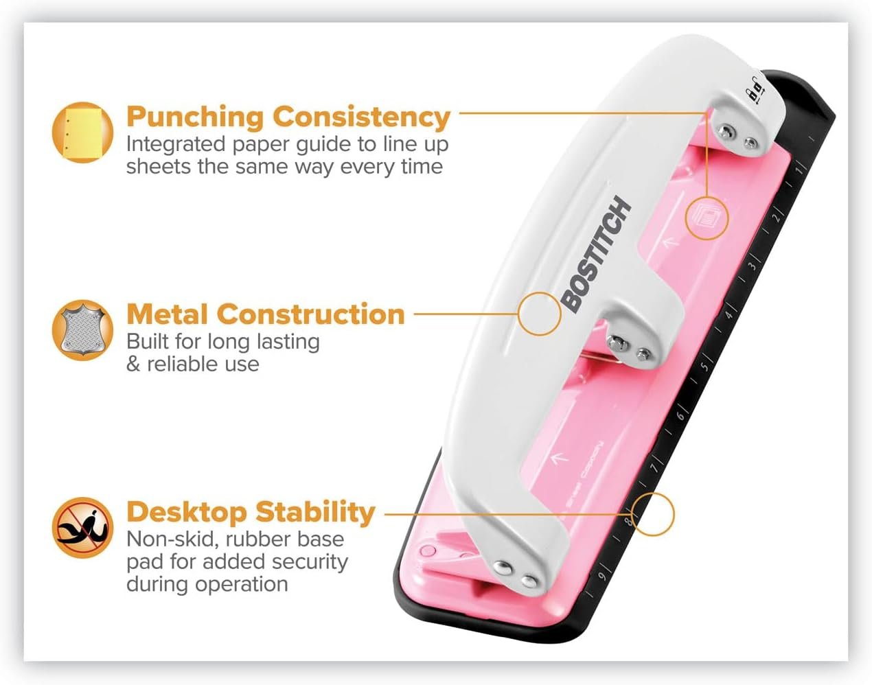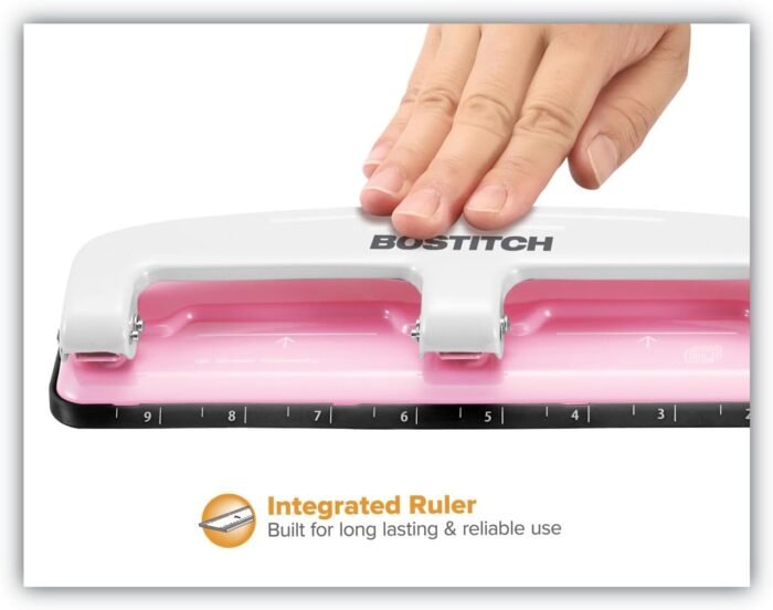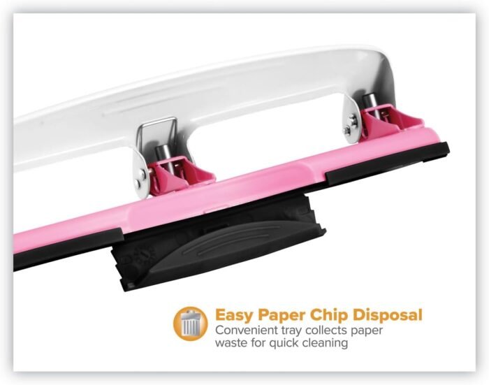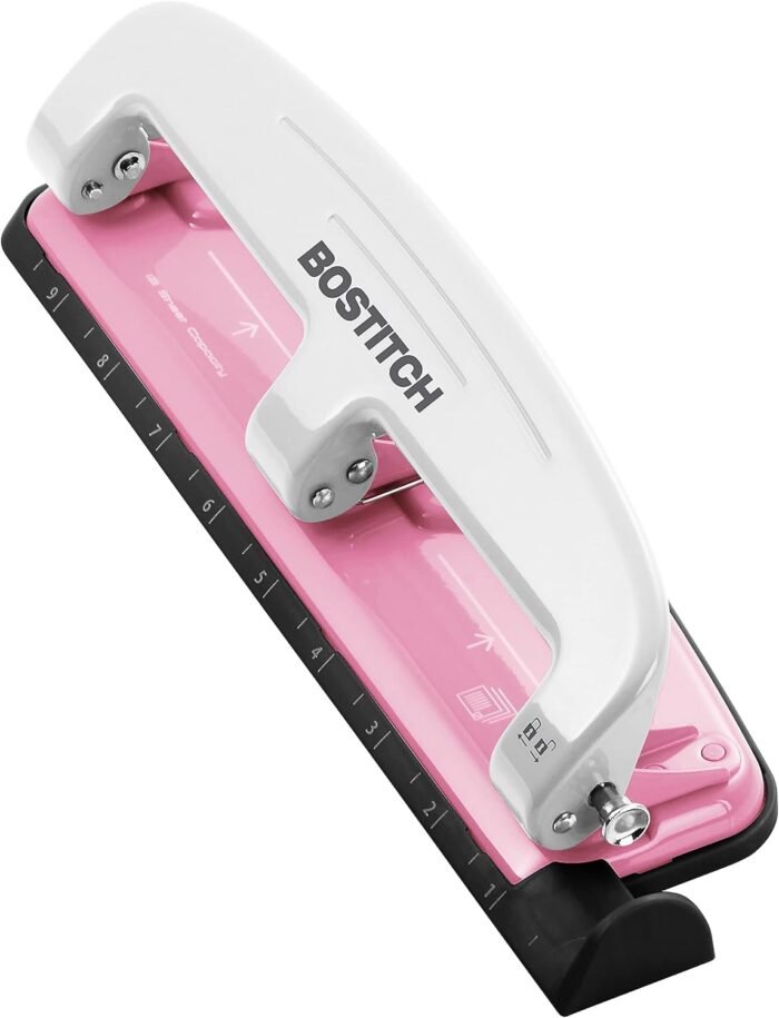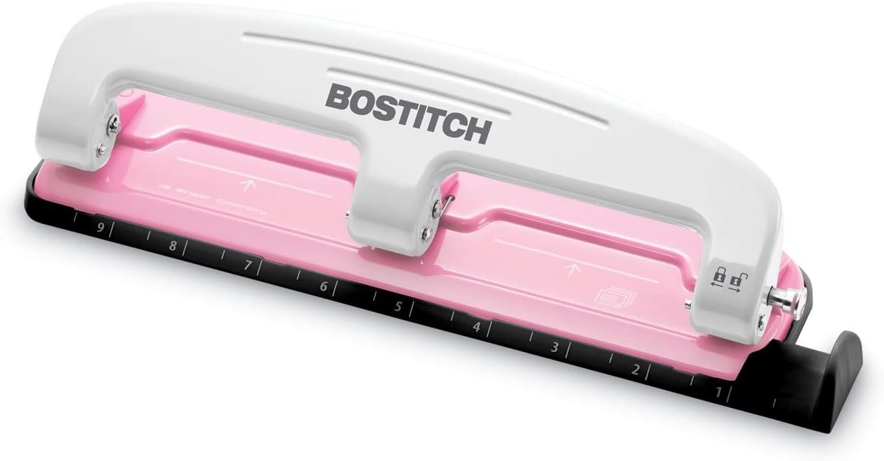 This is great. He got the pink so that we can see it instantly when we need to find it. I absolutely love it. It is a heavier weight metal reminiscent of the time all products were made with high-quality. Every aspect of this three whole punch is super high-quality. It’s fun to use it and it cuts with ease through all the paper. 1 page to 12 pages effortlessly. I like the fact that it is not adjustable. We’ve always had adjustable ones that have never been adjusted for 10 years because everyone needs the three holes in the same place. Lol! so I feel real secure with this one that it’s not going to readjust on its own.