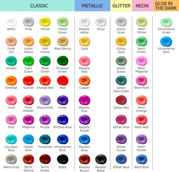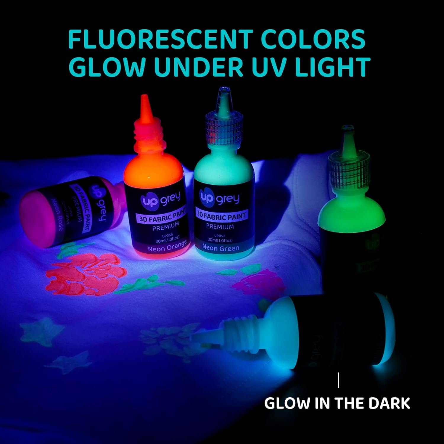 60 COLORS 3D FABRIC PAINT: This permanent fabric paint set contains 60 different colors, including 32 classic, 10 metallic, 8 neon, 8 glitter and 2 glow in the dark color, extra with 3 paint brushes and 5 stencils. A Fabric paint for all your creative needs. Tips: for glow paint: Glow after avsorb LED light or sunlight for 1-2 hours, for Neon paint: Glowing under the UV light.