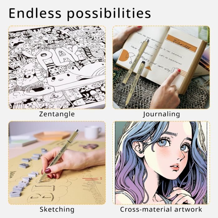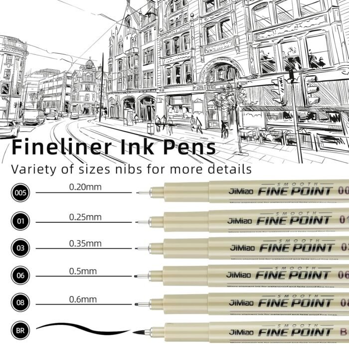This comprehensive micro drawing pen set– includes 0.20mm (005), 0.25mm (01), 0.3mm (02), 0.35mm (03), 0.40mm(04), 0.5mm (06), 0.6mm (08), 0.9mm(10),1.0mm (1), 2.0mm (2),3.0mm (3), and a brush, offering a variety of sizes for your needs,From ultra-fine lines to bolder strokes, you’ll have the perfect tool for every detail and project.