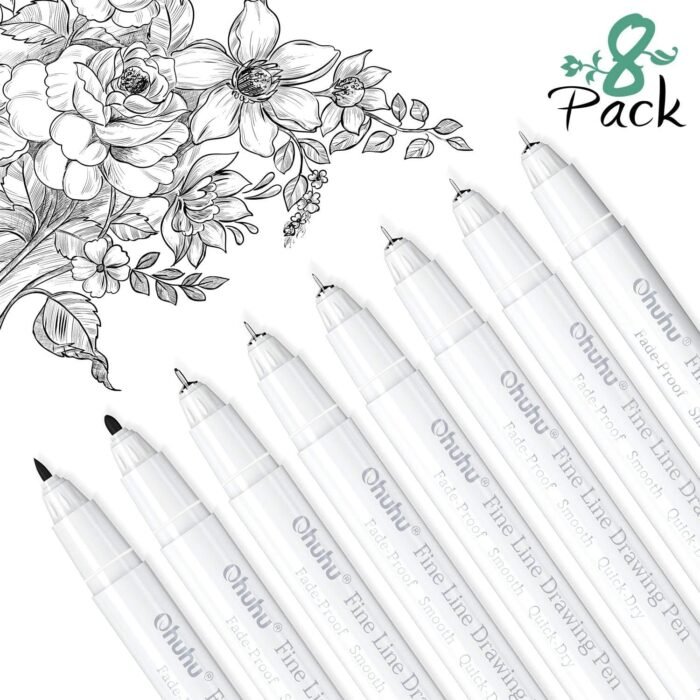 Ohuhu Fineliner Pens Micro Drawing Pens: 8-size Tips (Ultra-fine, Fine & Brush) Waterproof Pigment Black Ink for Illustration Drawing Journaling Sketching for Artist Beginners | ⭐ Art Stationers Best Choice