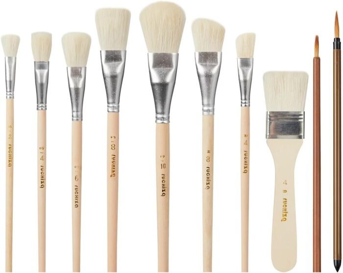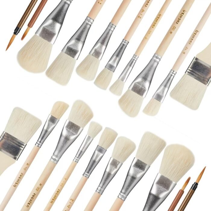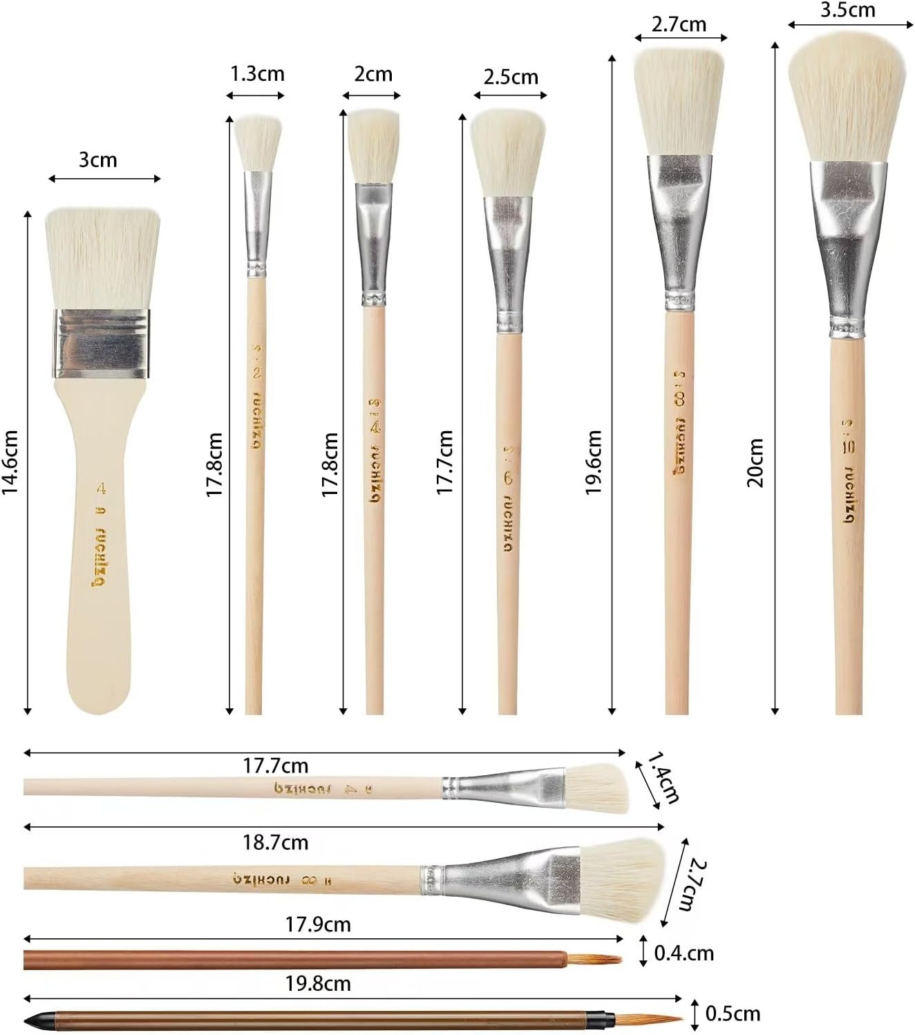 1.ćComplete 10-Piece Professional SetćOur premium pottery brush kit includes 2 fine wire brushes for detailing, 5 pure wool mop brushes (multiple sizes), 2 angled glazing brushes, and 1 flat smoothing brush – everything needed for professional ceramic work from base coating to intricate detailing.