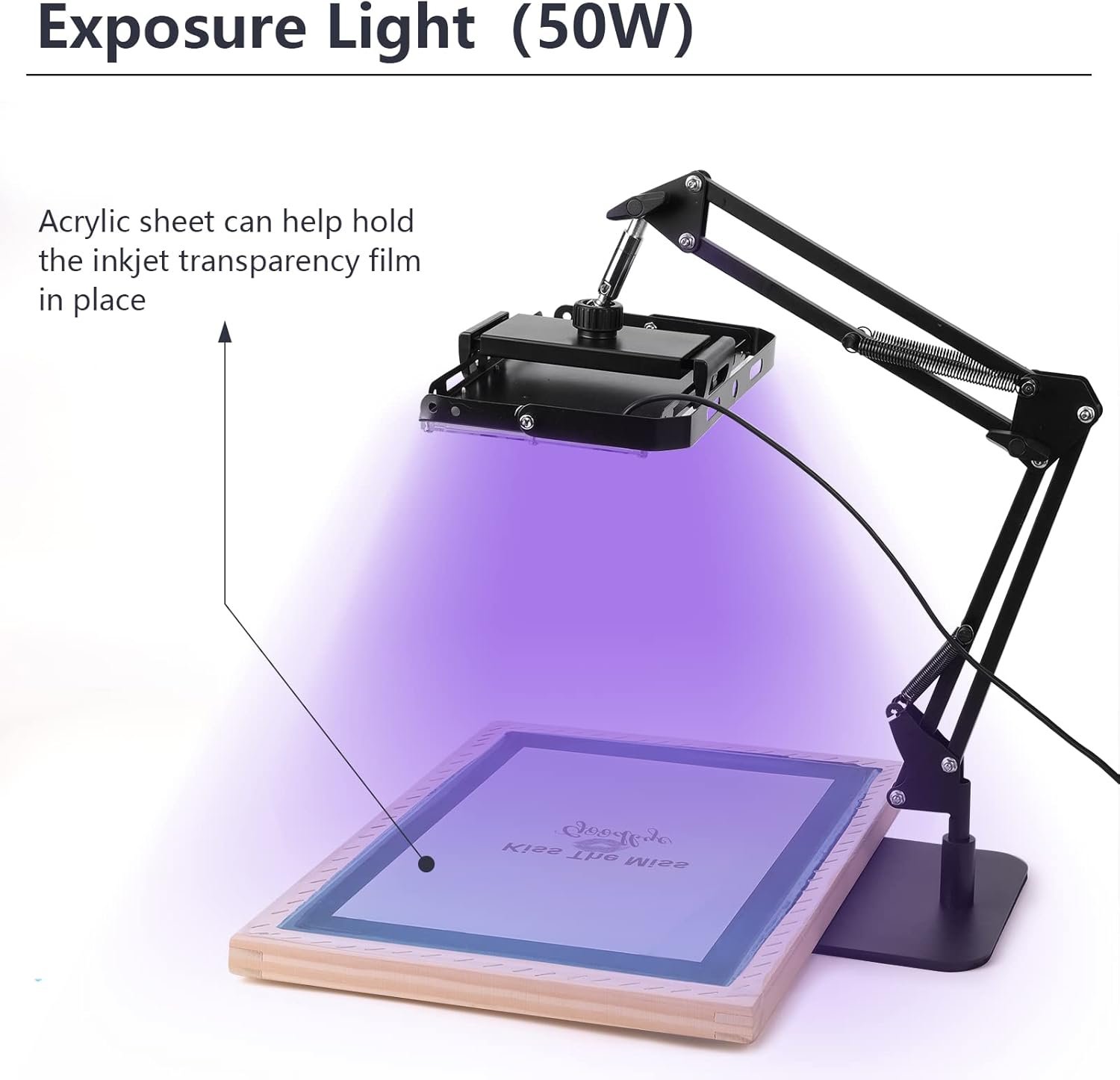 ćScreen Printing Exposure LightćA 50W screen printing exposure lamp with a stable lamp holder, even exposure, and long filament service life, which can effectively shorten the curing time of emulsion