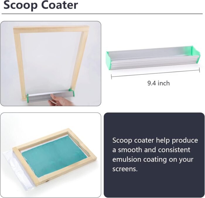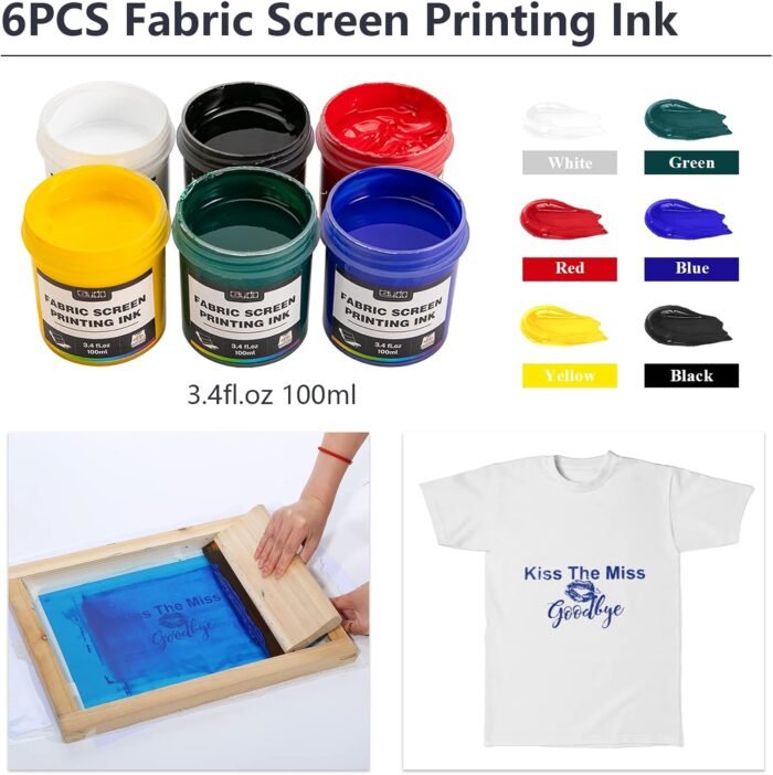 ćInk and Photo EmulsionćIncluding 6 cans of 3.4fl.oz (100ml) silk screen printing ink (black, white, red, blue, yellow, green), which is suitable for cotton, polyester, blends, linen, rayon, and other synthetic materials, as well as paper and cardboard. The capacity of the photo emulsion is 140ml, with the assistance of the emulsion scoop coater, making the ink thickness uniform and flat, presenting a better screen printing effect