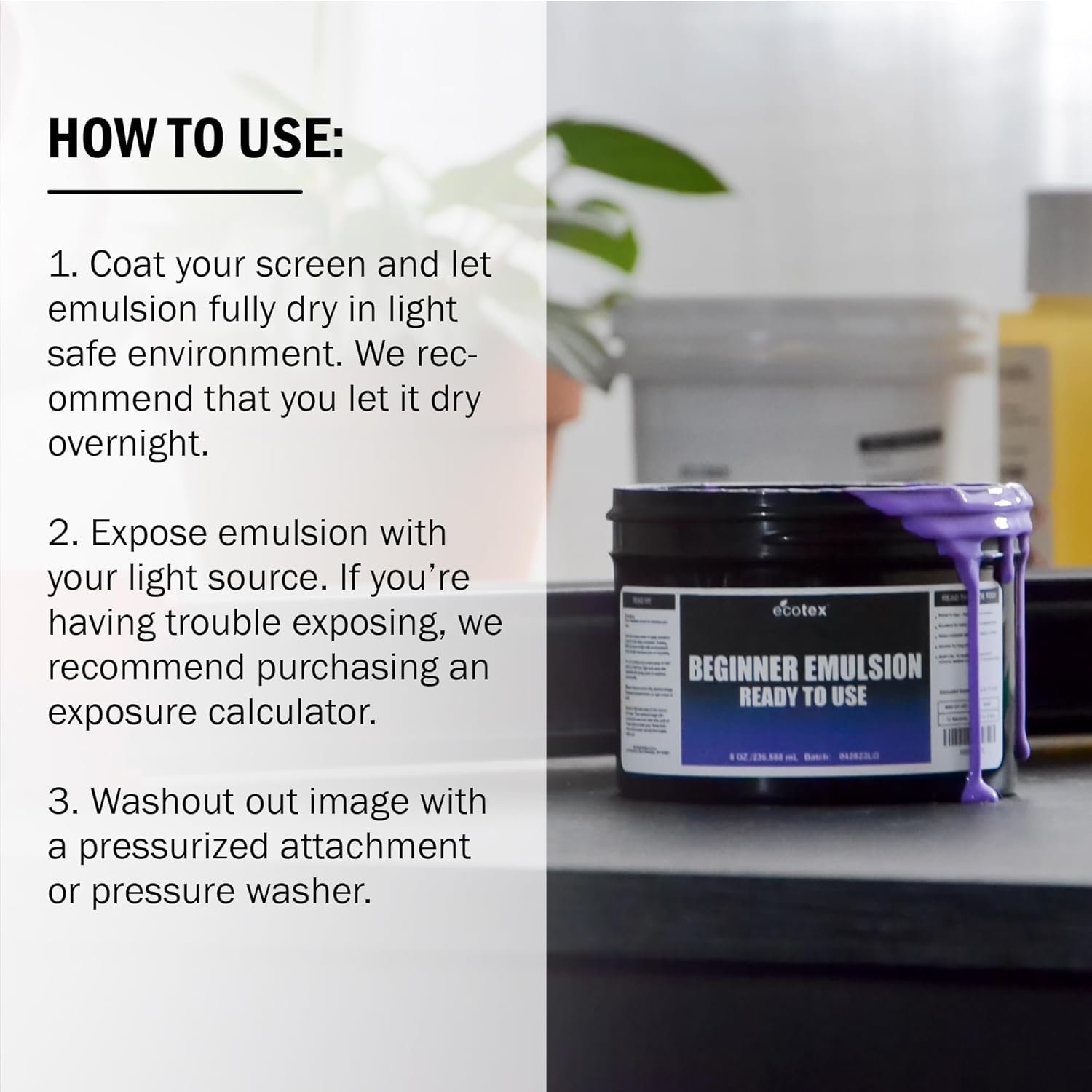 This is easy enough to use. The product is as described but in my personal opinion being a “beginner” screen printer and trying to figure out photo emulsion- just get the speedball Diazo kit or better yet the entire beginner kit with the screen lock frame. It’s almost easier to apply than this and has a much quicker dry time. There is nothing wrong with this product and I appreciated the lessons learned while trying it out.