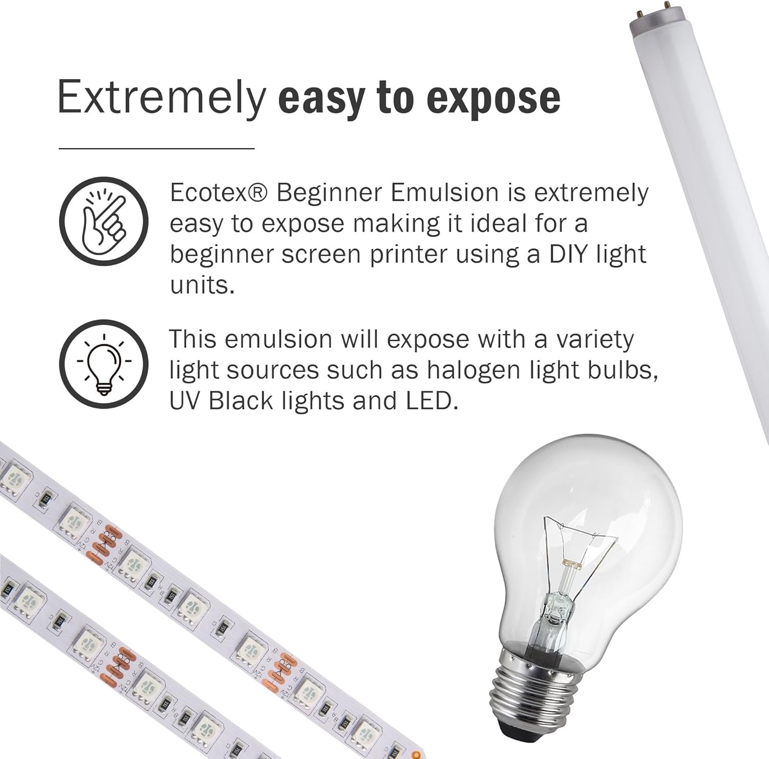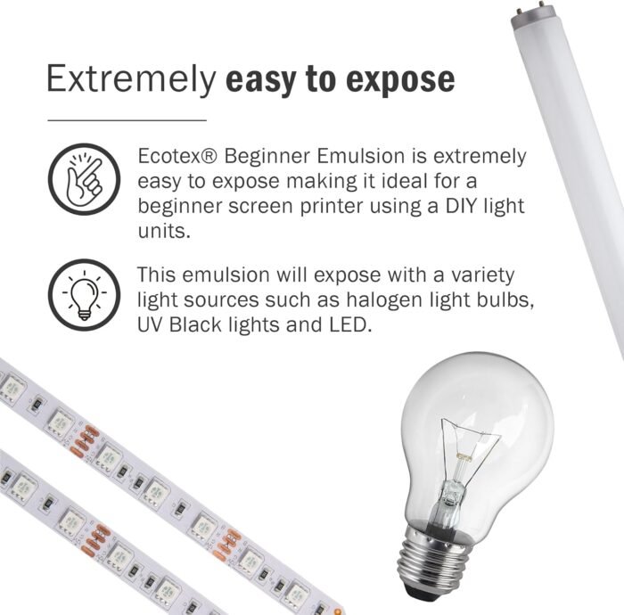 Once I got the timing down, this emulsion works really well. I’m used to using halogen light boxes and burning for a couple of minutes. I just built a 60 watt UV LED box at home and this emulsion burns almost faster than you can blink! I zoned it in at 6 seconds, which blows my mind.A lot of the reviewers here are having a hard time washing out their screens, and that’s because of overexposure. When the timing is done right, you will easily see the outline of your image before washing. I could wash the image out using just the water sprayer at my kitchen sink. No need to fire up the power washer here.Some other tips: Keep your coated screens in a very dark place while drying and before burning. Don’t even smile at it, because a sunny personality will expose this emulsion!I’m fitting foam covered with black felt on the back of the screen while burning. Make sure whatever you’re holding up to the back of the screen is dark so you don’t get reflection causing overexposure. Also, give your screen some distance from the light source.I hope this helps other people! It sure would be helpful for a so-called beginner emulsion to have some additional troubleshooting tips for users.
