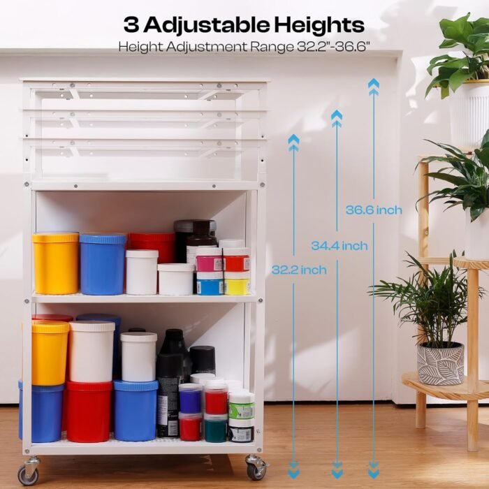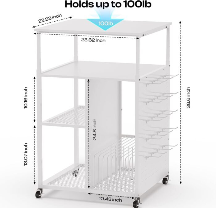 This car has many functions. I use it for my heat press and holding some of my vinyl material. It’s easy to put together and fits in a compact space. It is a very quality piece made of metal. It is very well priced for the quality of the product