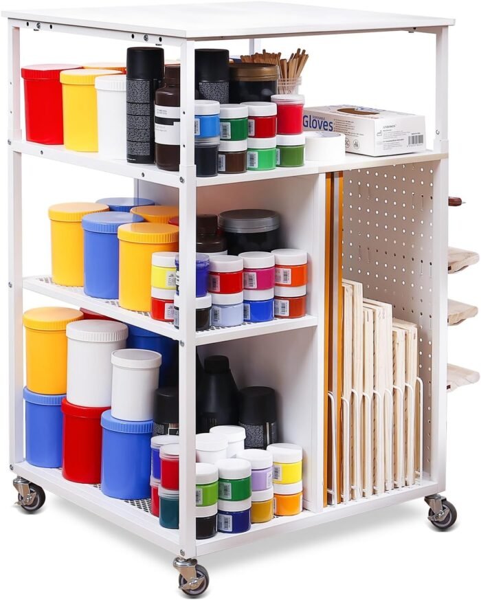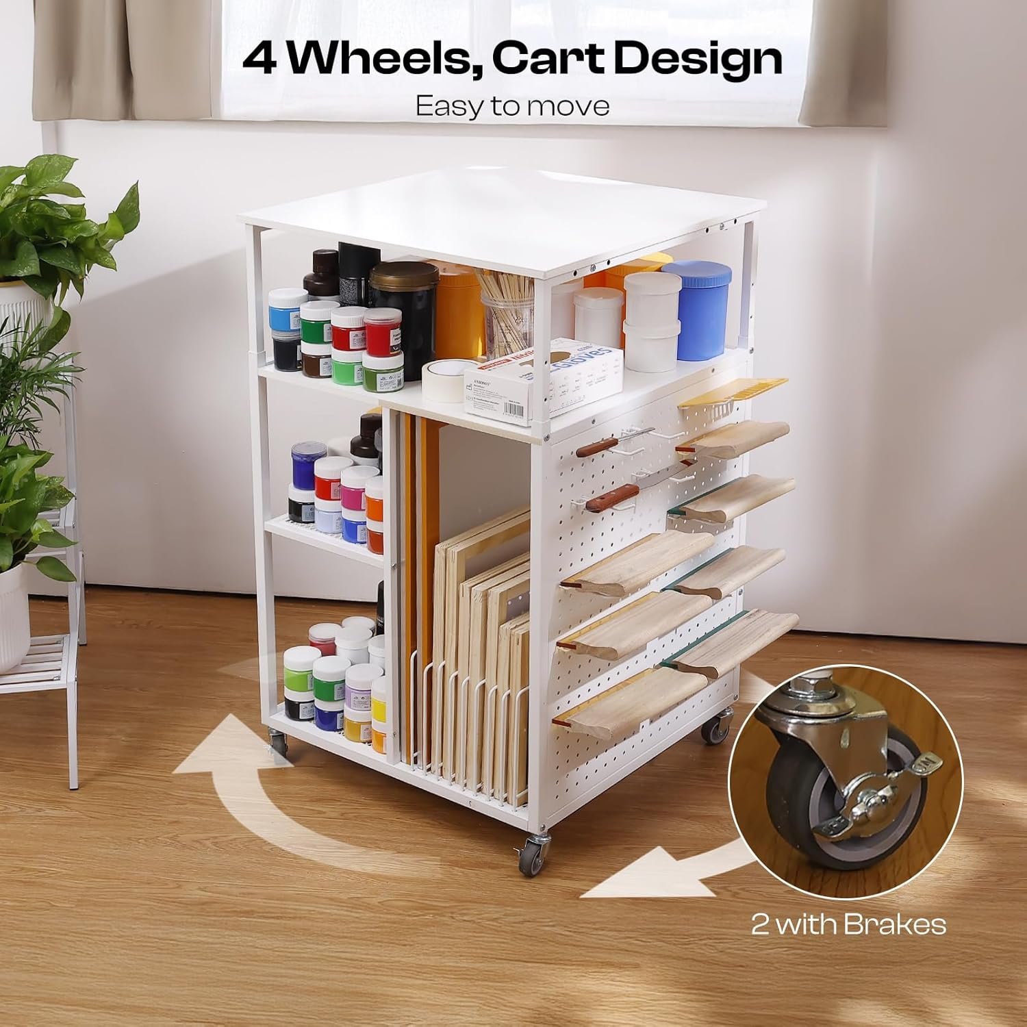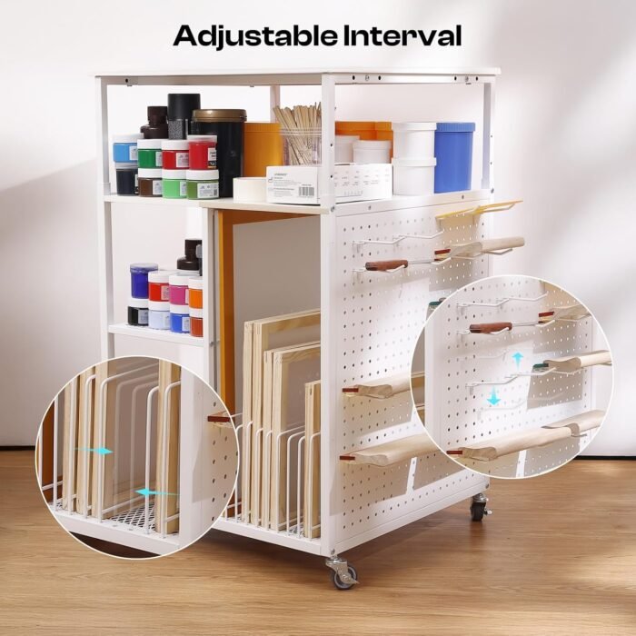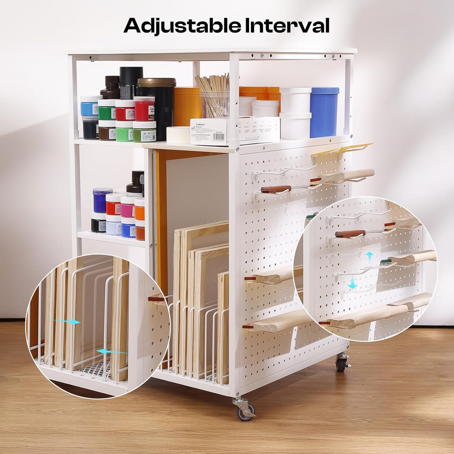 Adjustable Frame Rack & Pegboard: Store up to 10 frames (max 20×24ā€) with customizable intervals. The pegboard includes 20 hooks for versatile tool organization.