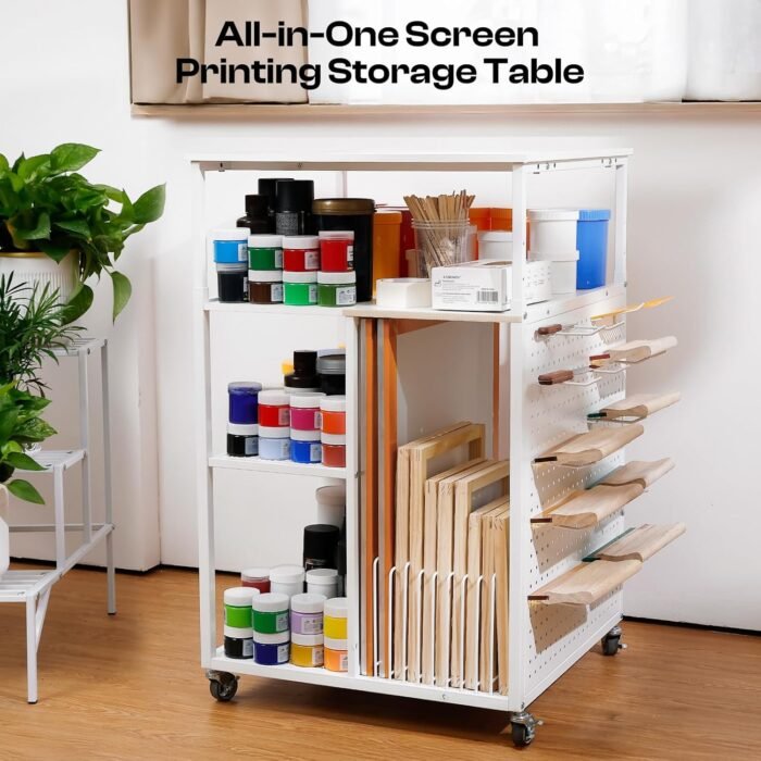 Comprehensive Storage Solution: Keep everything organized—frames, machines, inks, and tools. A spacious tabletop fits a 4-color, 1-station machine, while the side pegboard holds squeegees, spatulas, and tapes for easy access.