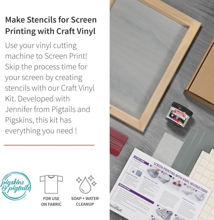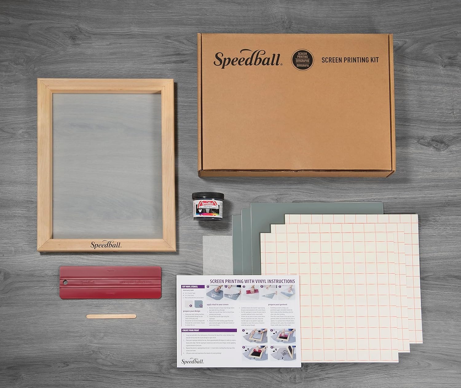 WHAT’S INCLUDED – Kit contains (1) Speedball Red Baron Squeegee; (1) 10×14 Wood Frame & Mesh; (1) 4OZ Speedball Fabric Screen Printing Ink (Black); (3) Sheets of Craft Vinyl; (3) Sheet of Transfer Tape; (1) Sheet of Bienfang Parchment Paper; (1) Craft Stick, and Instructions.