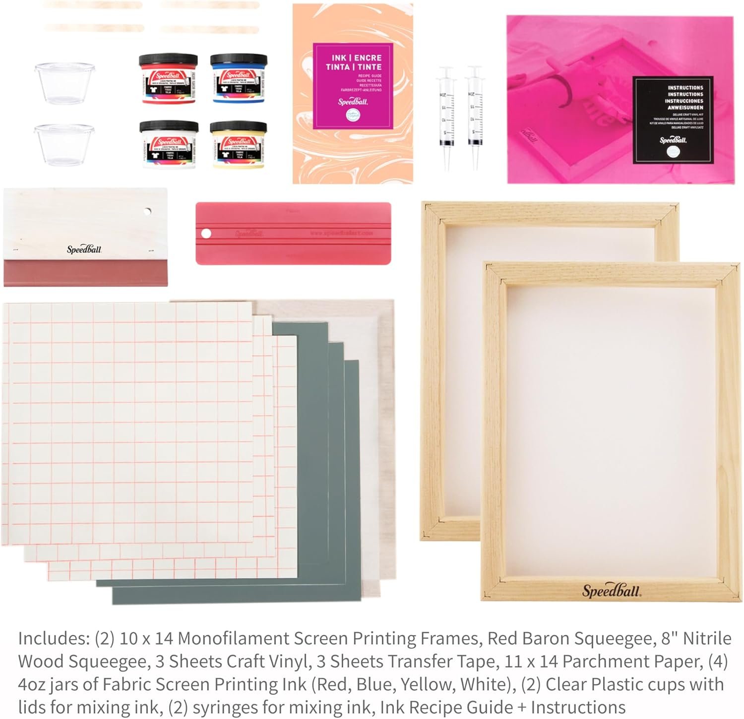 INCLUDES – (2) 10ā x 14ā Speedball Wooden Screen Frame; Red Baron Squeegee; 8ā Textile Squeegee; (4) 4oz Speedball Fabric Screen Printing Inks (White, Yellow, Blue, Red); (4) Craft Sticks; (3) Vinyl Sheets; (3) Transfer Sheets; (2) 30ml Syringes; (2) 4oz Plastic Cups; (1) 11ā x 14ā Parchment Paper; (1) Ink Mixing/Recipe Guide; (1) Instruction Guide.