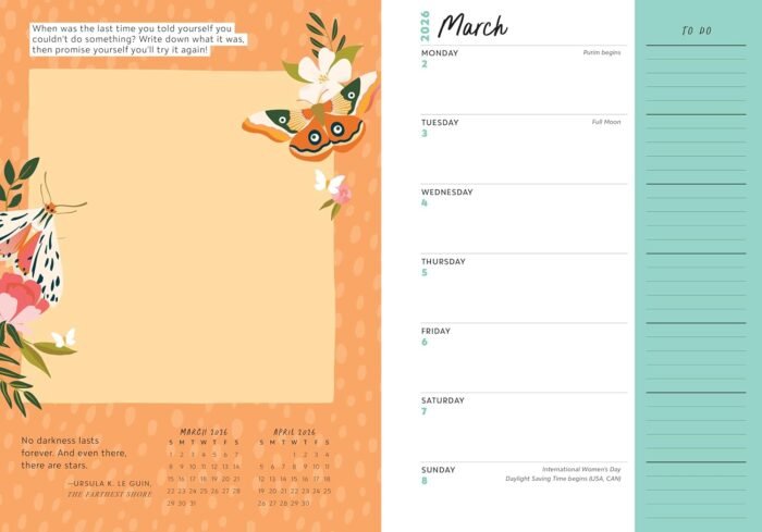 You absolutely cannot go wrong with the Amy Knapp Calendars. I have bought them for years. There is adequate space from each day’s activities for our very busy family. I have always bought the family themed, but this time bought the busy lady one! I am a convert. The journal prompts on the opposite page have become a favorite action item for me. The books are incredibly well made and well thought out. š Holidays and lunar phases are listed on applicable dates.I only wish they still made the zippered covers for these. Mine wore out long ago and it was such a treasure!