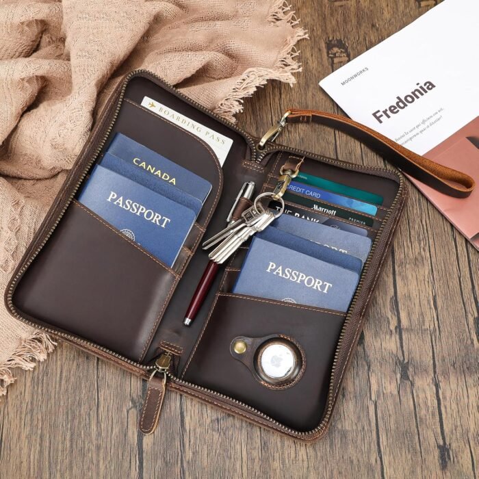 Customers praise this travel wallet’s solid construction, smooth silky leather, and marble-like appearance. The wallet is well-organized with many pockets, and one customer notes it’s perfect for international family travel. While the size is big enough to hold family passports, some customers find it too large for pockets.