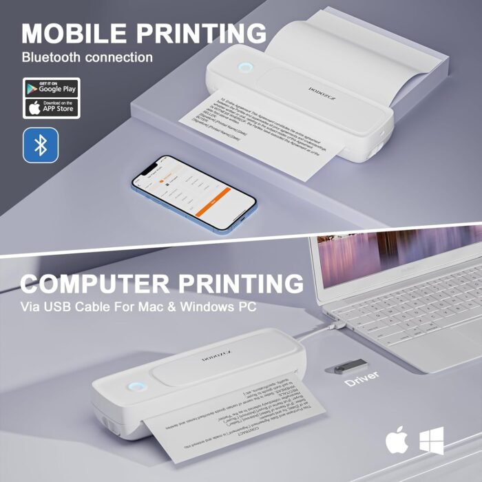 Bluetooth Printer-strong compatibility Printer, Our mobile sticker printer easily connects to smart devices with iOS & Android systems via Bluetooth, and also functions as a compact printer for laptops and computers. Setup takes just 5 minutes from unboxing, making it a breeze to get started. (Note: For smartphone printing, please download the app in advance. For laptops, install the driver first.)