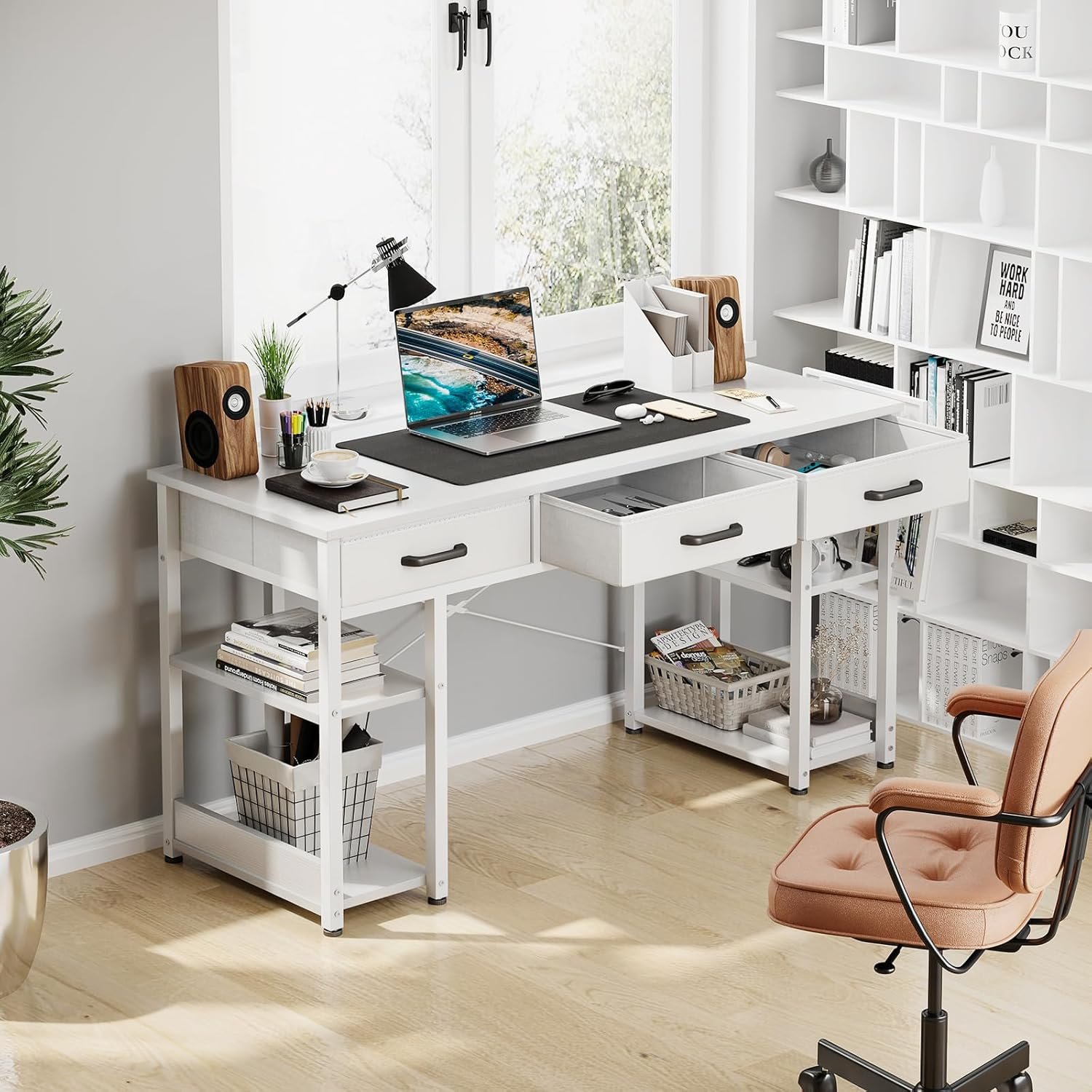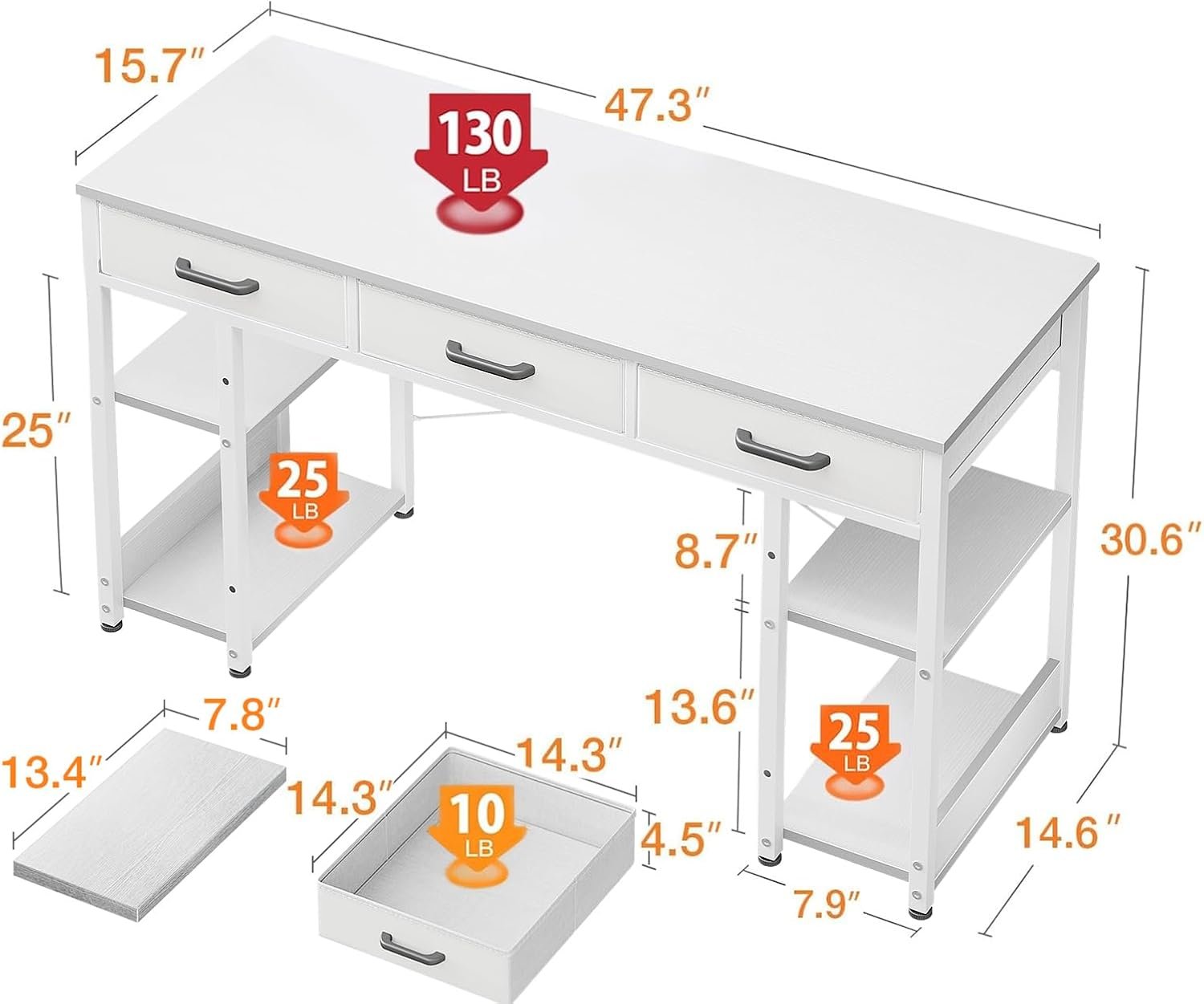 šćAll-in-one Versatility Computer DeskćThe perfect desktop size (47.3 inch*15.7inch) fits your laptop, books and 3 large capacity fabric drawers (each drawer can support up to 8 lb, about 2 laptops). Ample room for all of your office or work- from-home needs! The detachable underneath storage shelves of the desk can be placed in any size so it works perfect for any usage. (Eg: books, organizer.) There are also a lot more legroom and space for you.