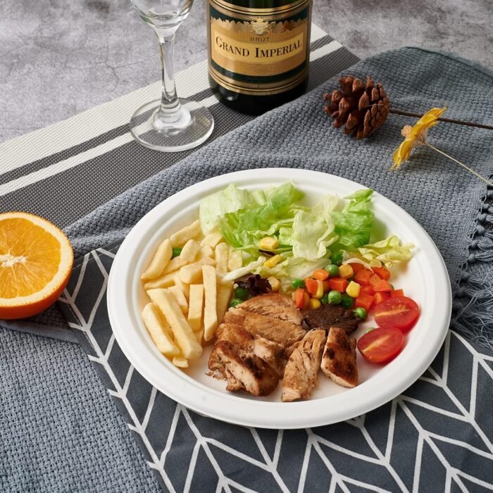 10-inch Paper Plates: Set includes 150 pack 100% compostable 10 Inch paper plates, White compostable plates can be matched with any food, perfect for serving sandwiches, burgers, pasta, salads, baked beans, french fries, and fruits