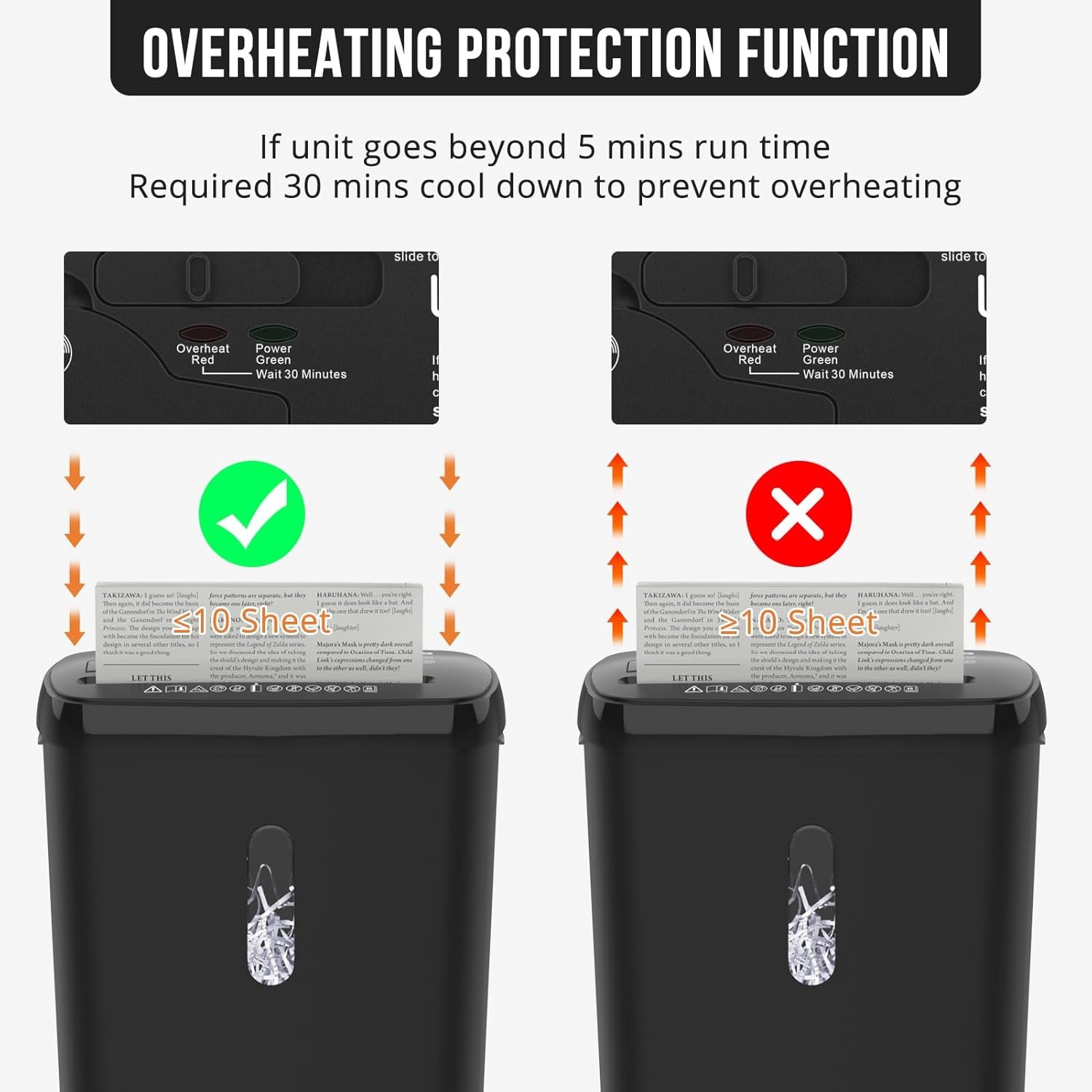 4. The shredder is equipped with overheat protection. If overheat protection is triggered during use, allow the machine to cool for at least 30 minutes before performing the next shredding operation.