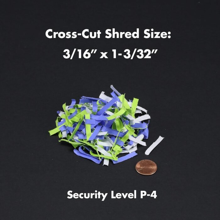 Shreds paper, CDs, DVDs, credit cards into small pieces (3/16 by 1-3/32 inches), security level P-4.