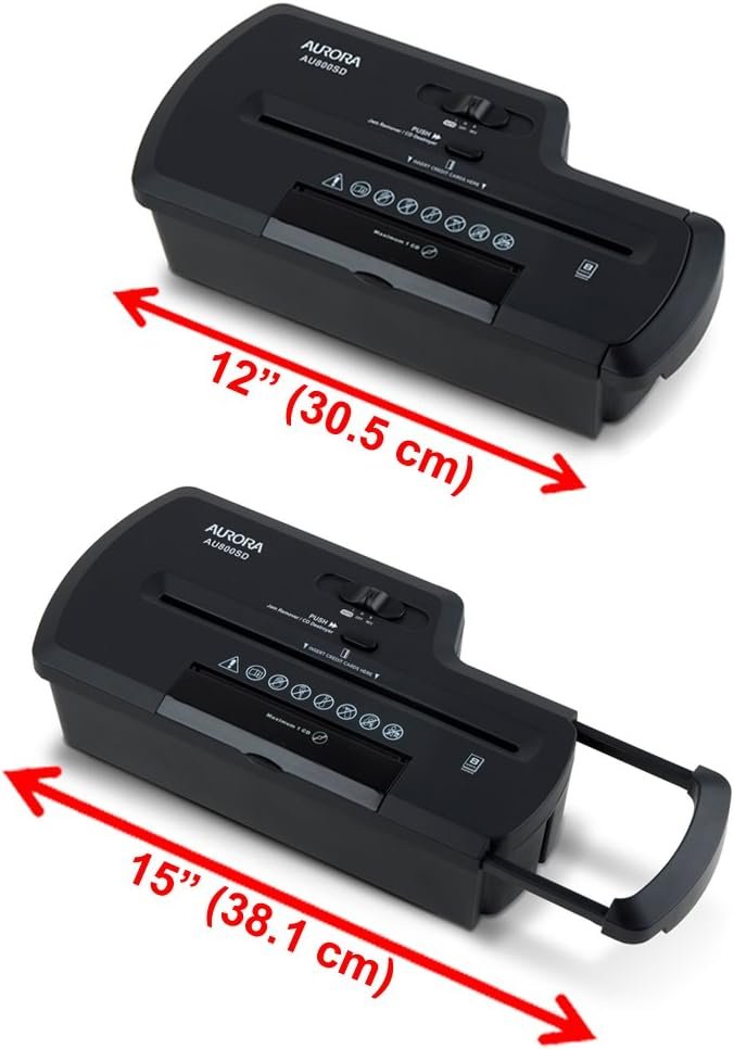 Designed to provide economical document security, this paper shredder is the perfect home device to help keep you safe from identity theft. The AU800SD accepts up to eight sheets of paper at a time and shreds them into 1/4-inch strips. Paper is shredded at a speedy 9.8 feet per minute. In addition to paper, the AU800SD shreds CDs and credit cards, keeping vital information from falling into the wrong hands. The throat of the shredder is 8.7 inches wide and the extendable arm fits over most wastebaskets. PRODUCT DETAILS: Sheet Capacity: 8 Cut Type: Strip cut Shred Size: 1/4″ wide strips Security Level: Level P-1 (general internal documents) Shreds: Credit cards; Small staples Continuous Run Time: 2 minutes Shred Speed: 9.84 feet per minute Recommended Shredder Use: household or home office Throat Width: 8.7″ Automatic Start/Stop: Yes Reverse Type: Manual Shreds Credit Cards: Yes Shreds CD/DVDs: Yes Overheat Protection: Yes Unit Size Dimensions: 13.00″ W x 6.50″ L x 2.95″ H Warranty: 1-year machine; 1-year cutters